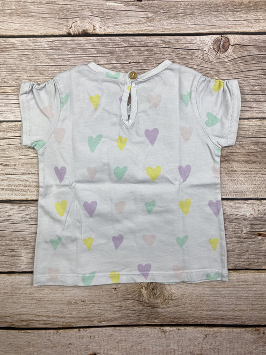 Produttore:BenettonT-shirt maniche corte con stampa cuoricini colorati sul davanti e sul retro. Chiusura con bottone sul retro. Macchia sul davanti.