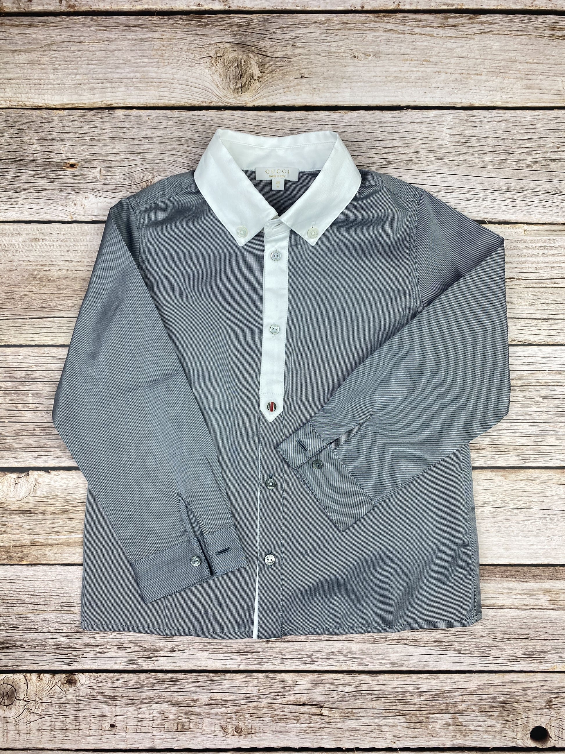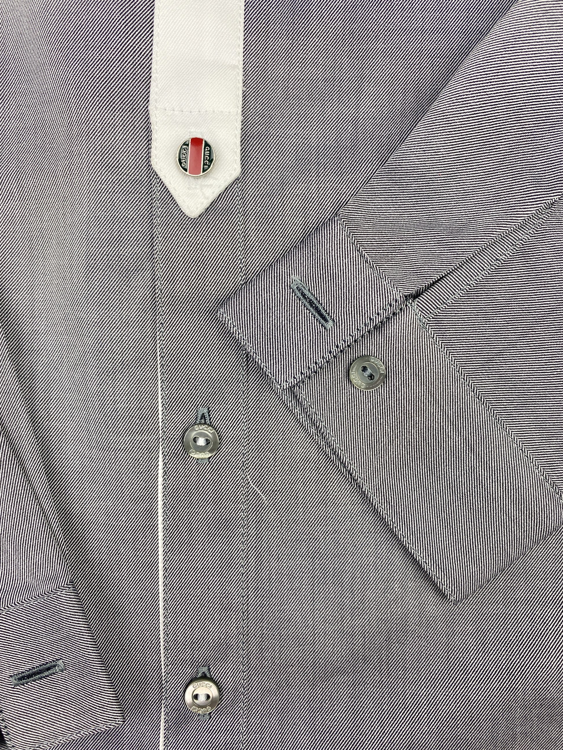 Camicia a maniche lunghe in cotone grigio, colletto bianco, chiusura con bottoni bicolor, bottone smaltato e logato Gucci