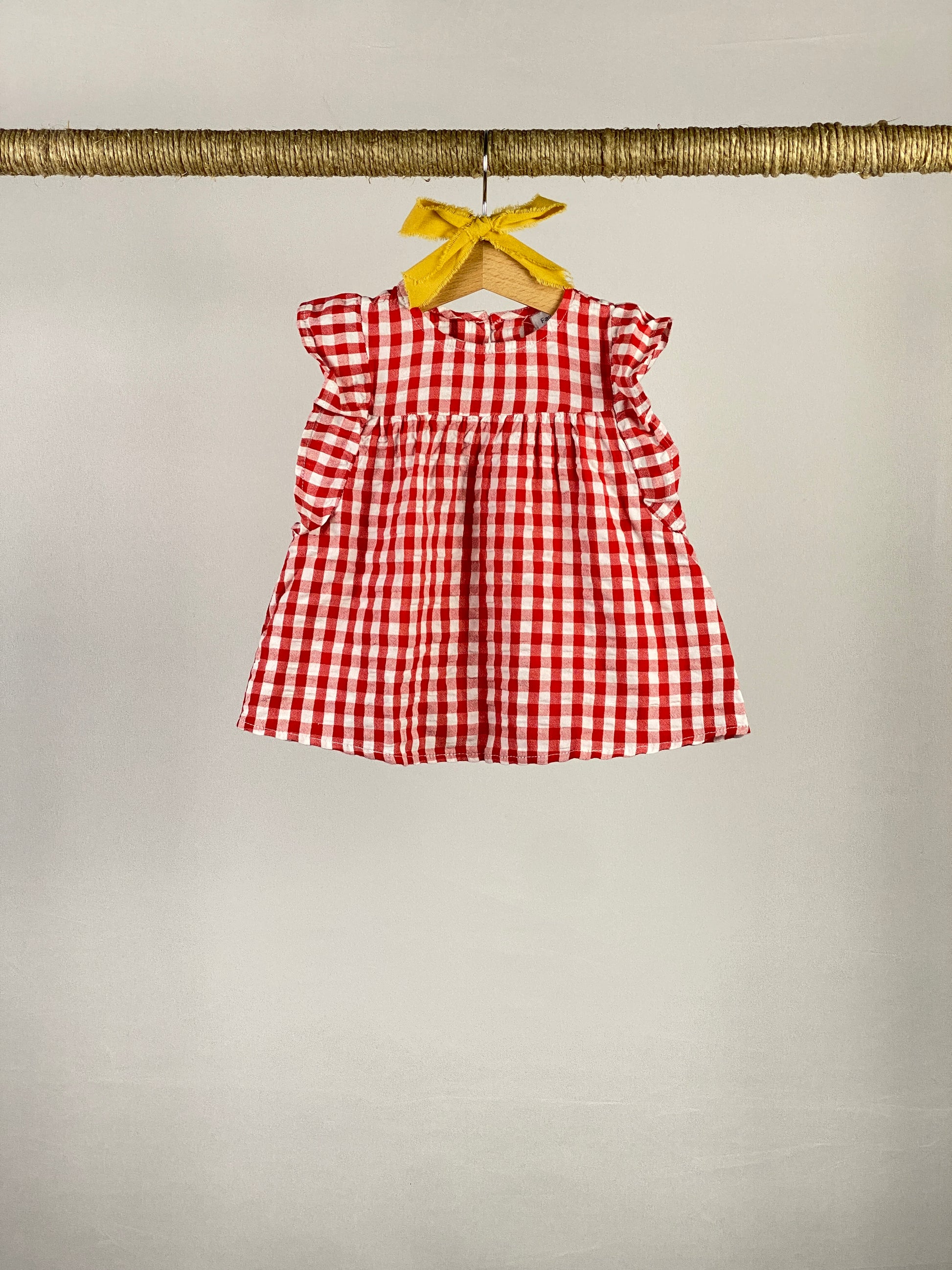 Camicia senza maniche a quadri rossi e bianchi con rouches sulle maniche. Bottoni sul retro.