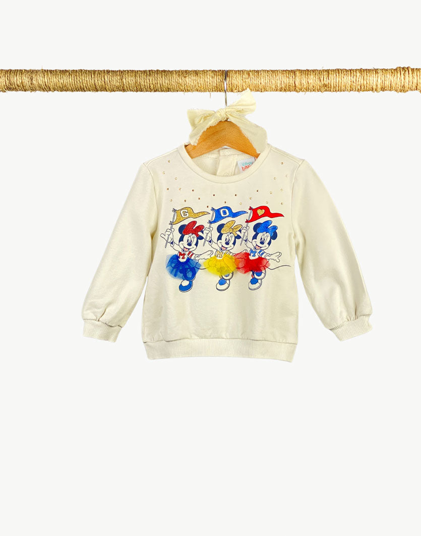 Felpa girocollo in cotone non garzato con stampa Minnie sul davanti arricchita da tulle e strass. Chiusura con bottoni sul retro.