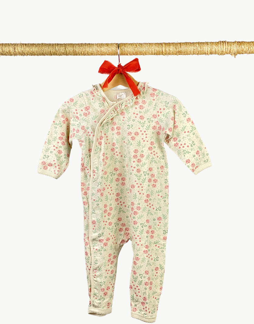 Pigiama intero con pantaloni e manica lunga con fantasia fiori e rouches su colletto. Chiusura con bottoni a pressione sul davanti.