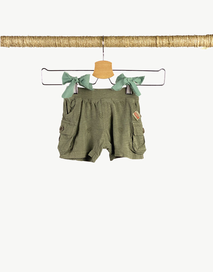 Pantaloncino corto cargo in jersey con stapa foglie in tono. Piccolo buchino ditro vivino alla cucitura dell'etichetta