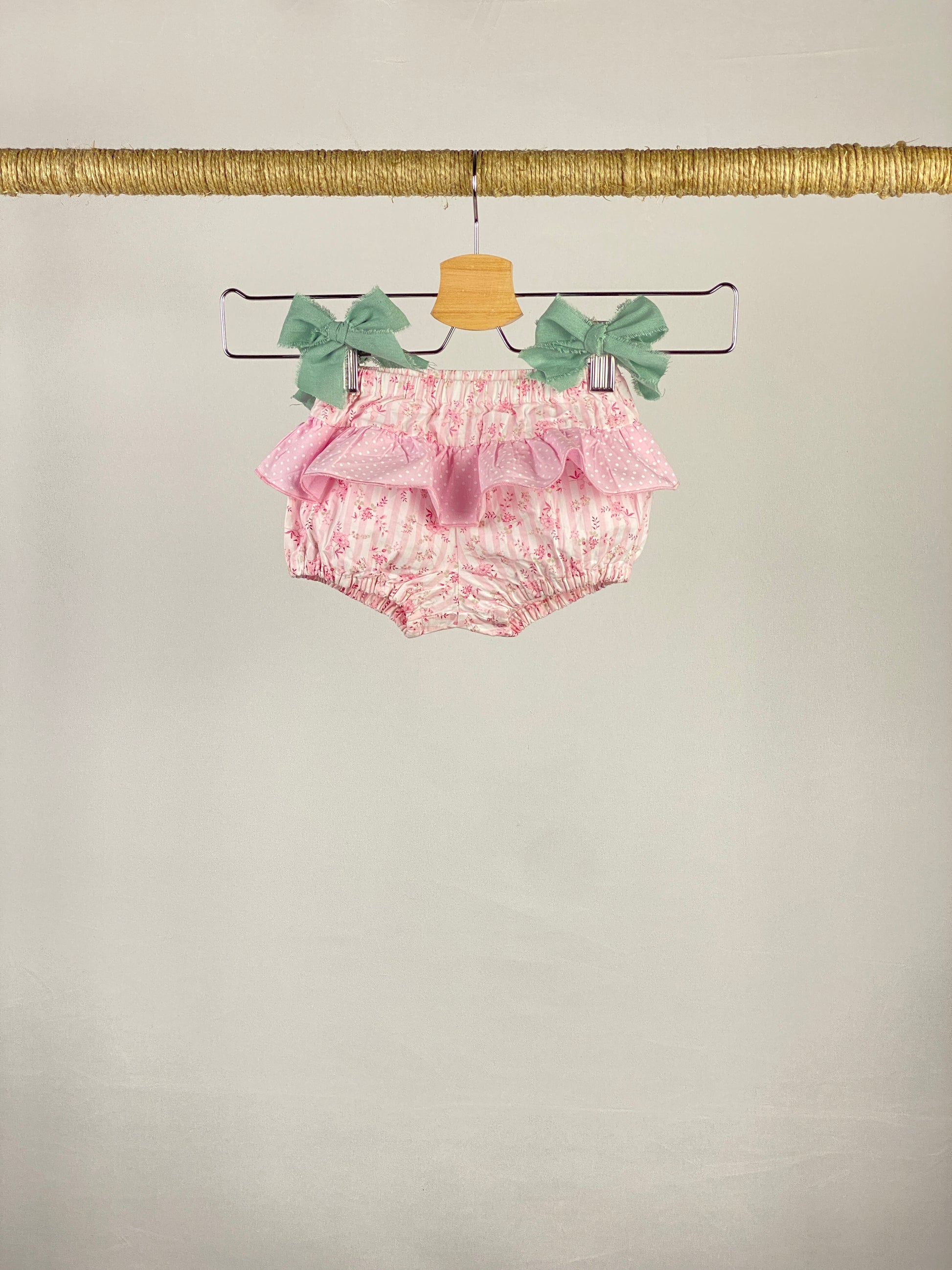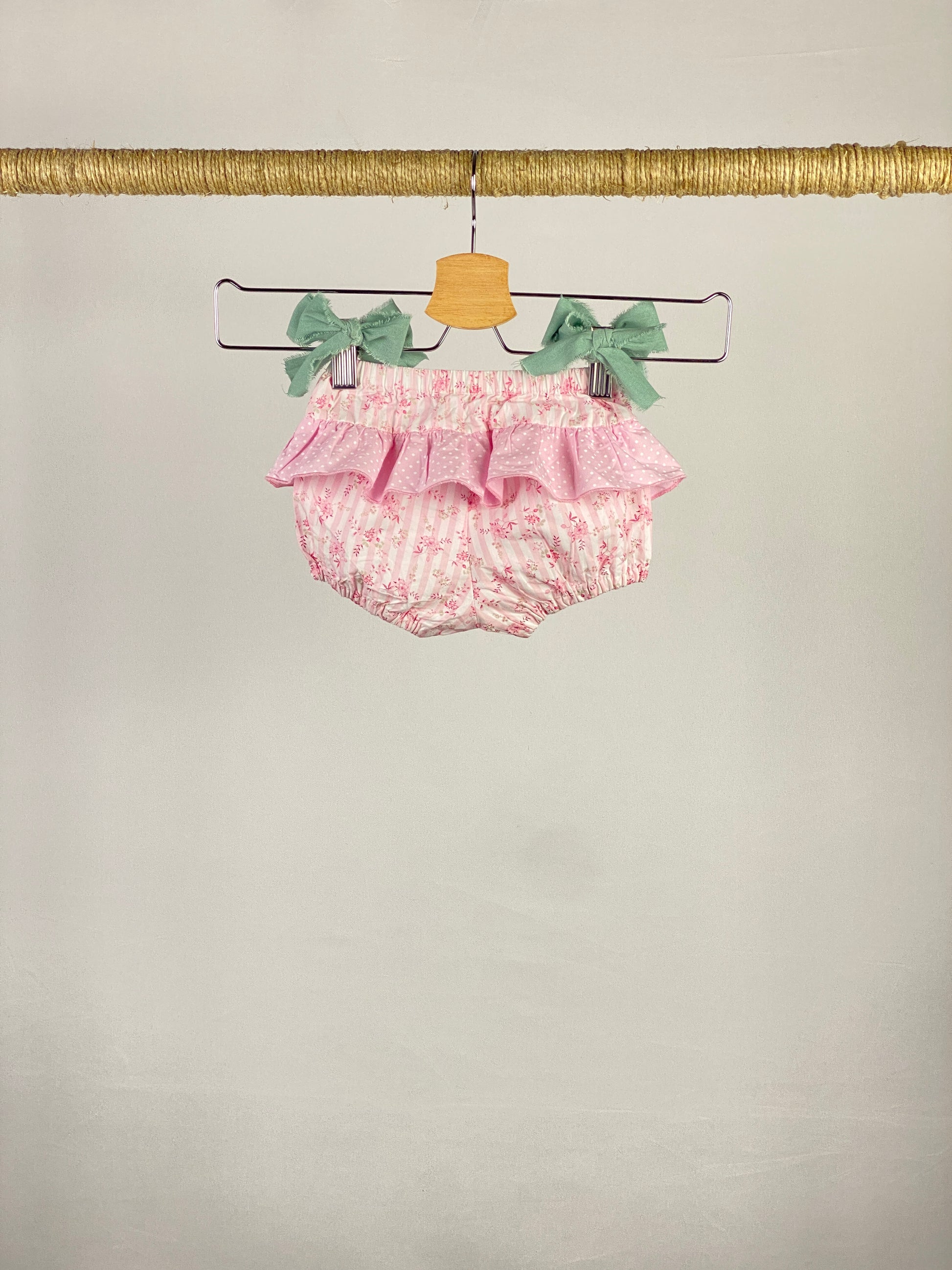 Pantaloncini con gonna con rouches a pois, elastico in vita, fantasia floreale.