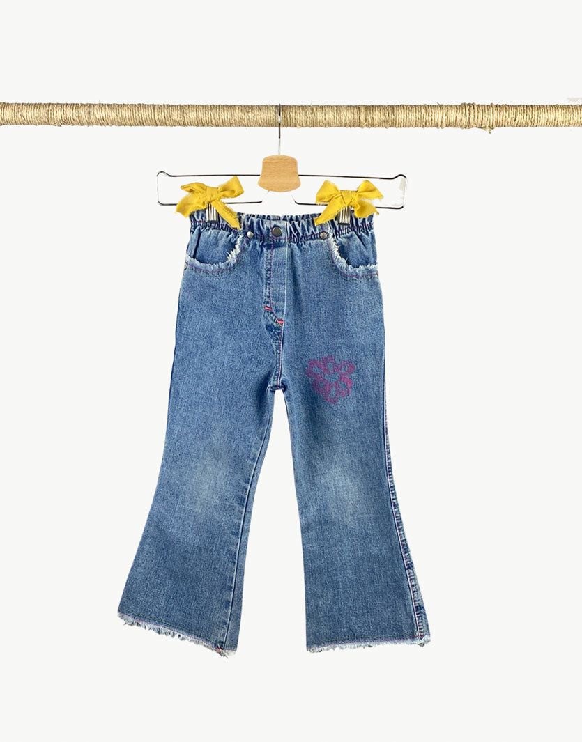 Pantalone in jeans a zampa con tasche e fondo sfrangiato, lavaggio medio, fiore stampato su gamba e cuciture colorate. Elastico in vita.