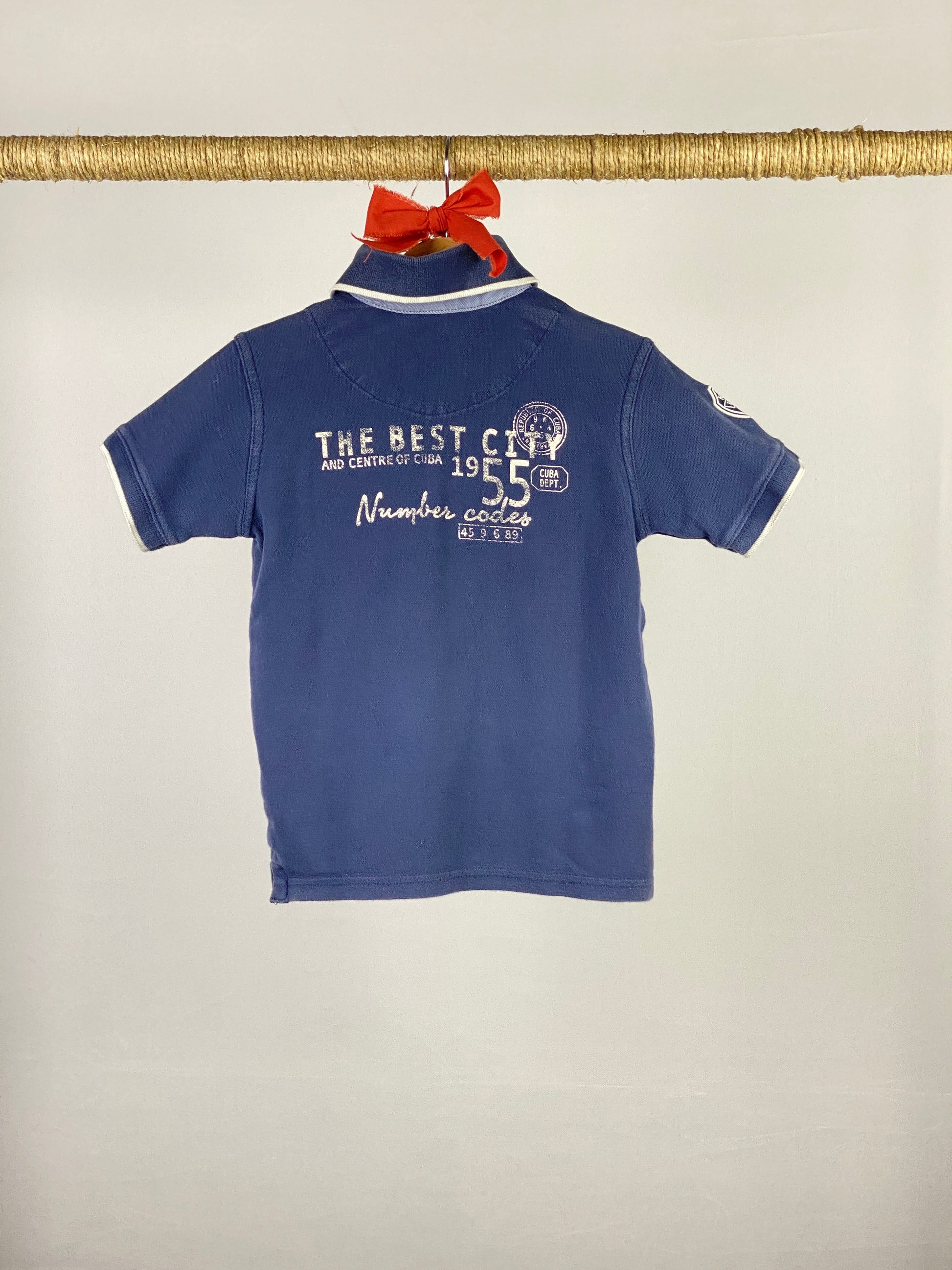 T-shirt polo a manica corta in cotone blu, colletto e giromaniche elasticizzati con riga bianca, quattro bottoni sul davanti e tasca con bottone lato cuore. Spacchetti ai fianchi, applicazione scudetto su spalla destra e stampa leggermente sbiadita sul retro