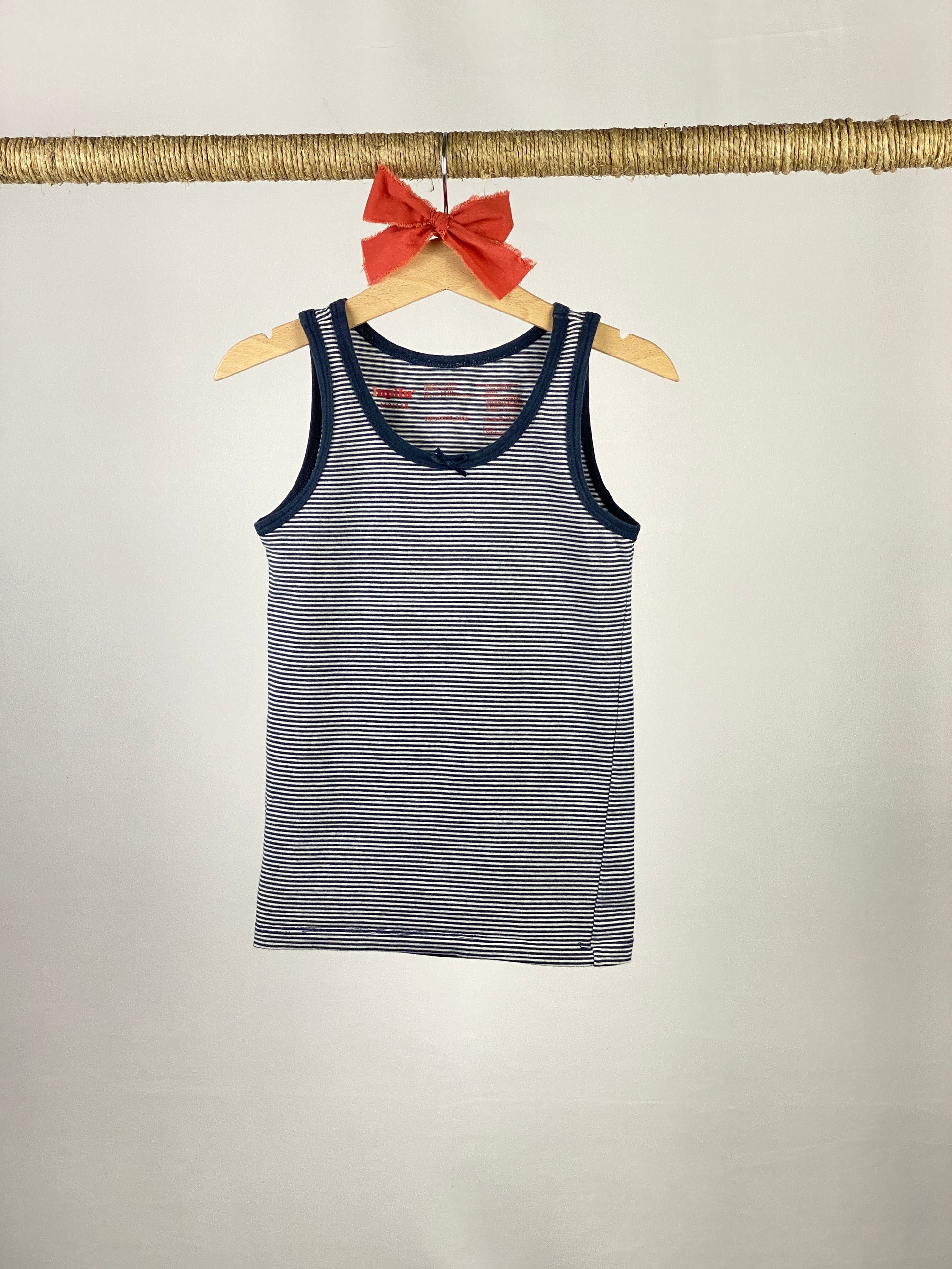T-shirt canotta blu a righe bianche con fiocchetto e bordo giromanica blu