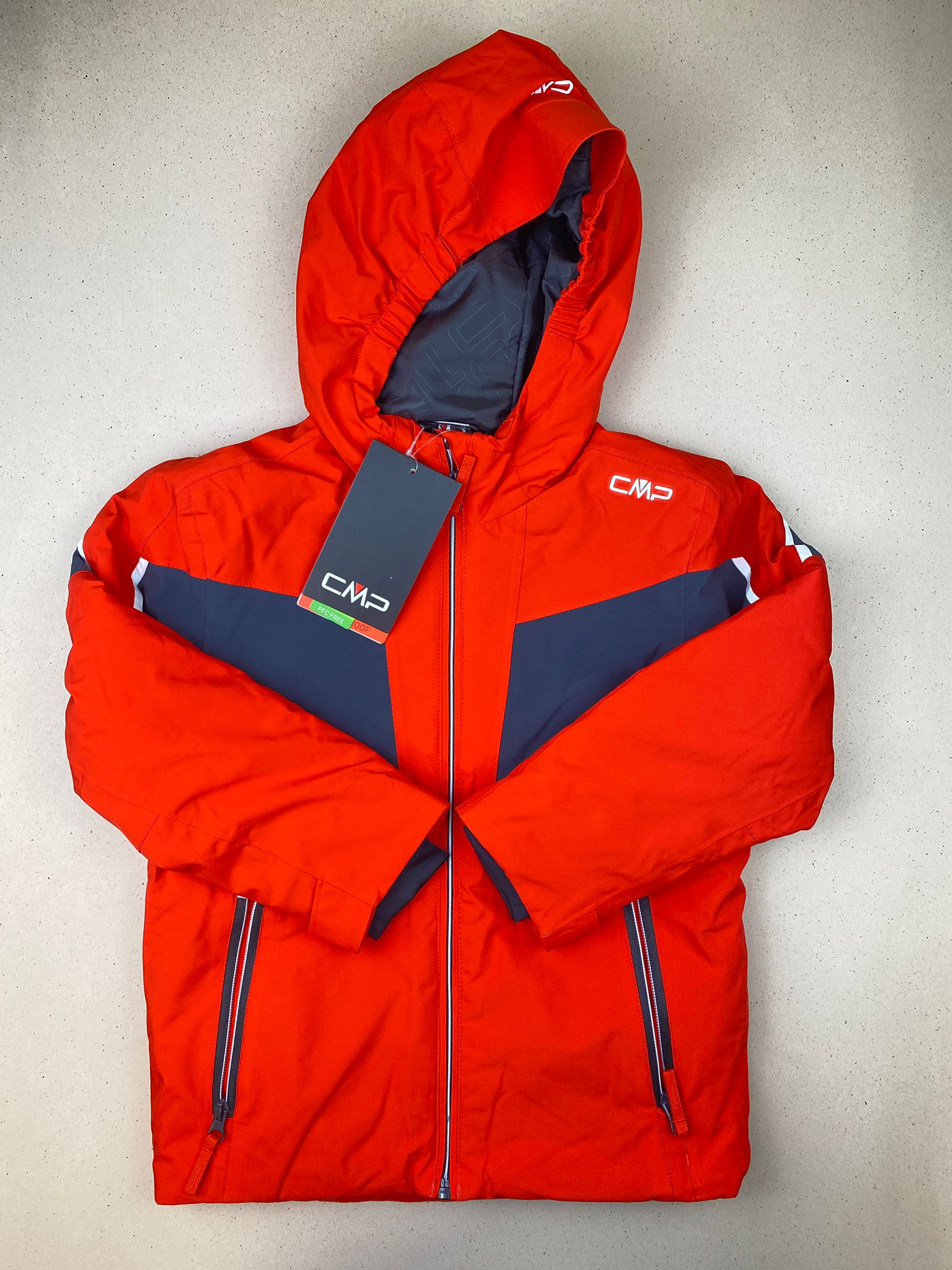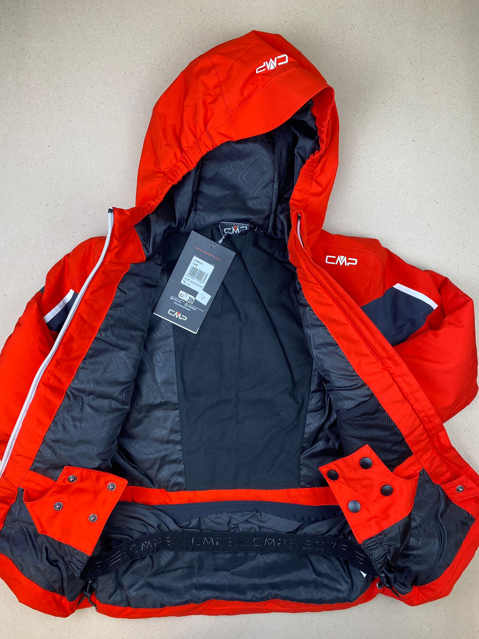 Giacca da sci color rosso e nero con cintura interna con bottoni a pressione, cappuccio non staccabile, tasca porta ski-pass su manica. Caratteristiche tecniche: 10.000 WP, 10.000 MVP.
