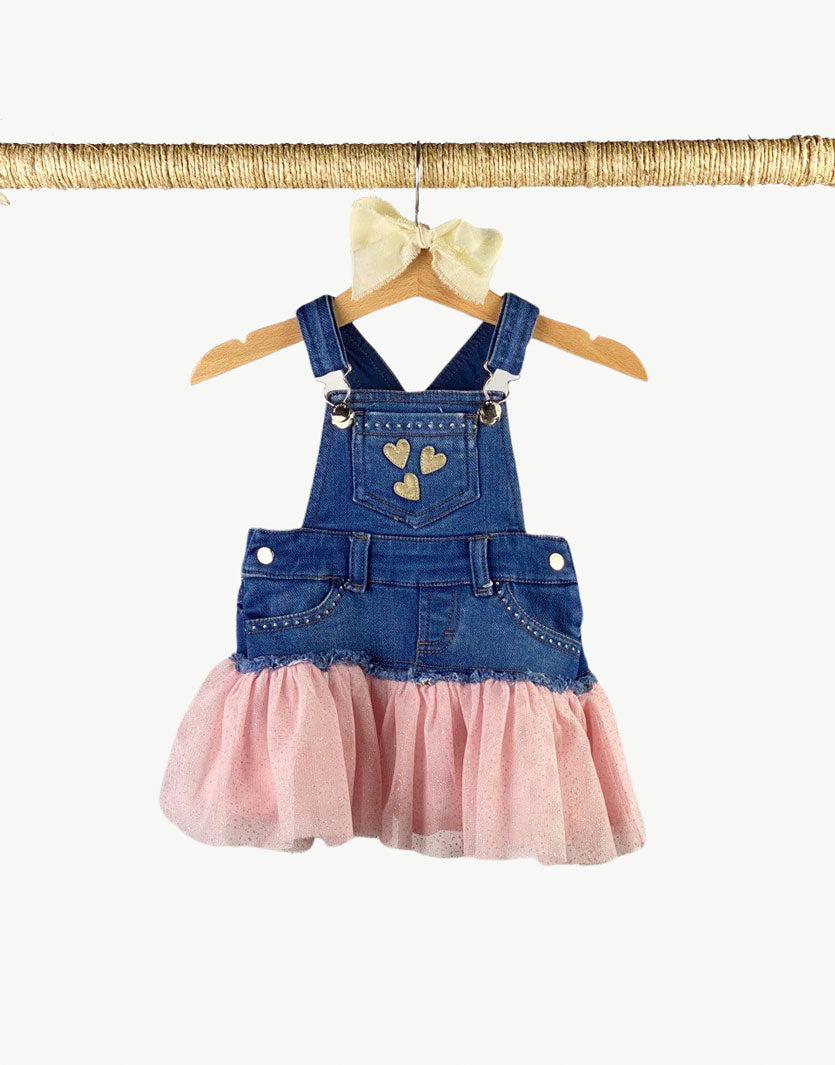 Salopette gonna in jeans con gonna in tulle rosa e glitter argentati, bretelle regolabili e applicazione cuiri sul davanti
