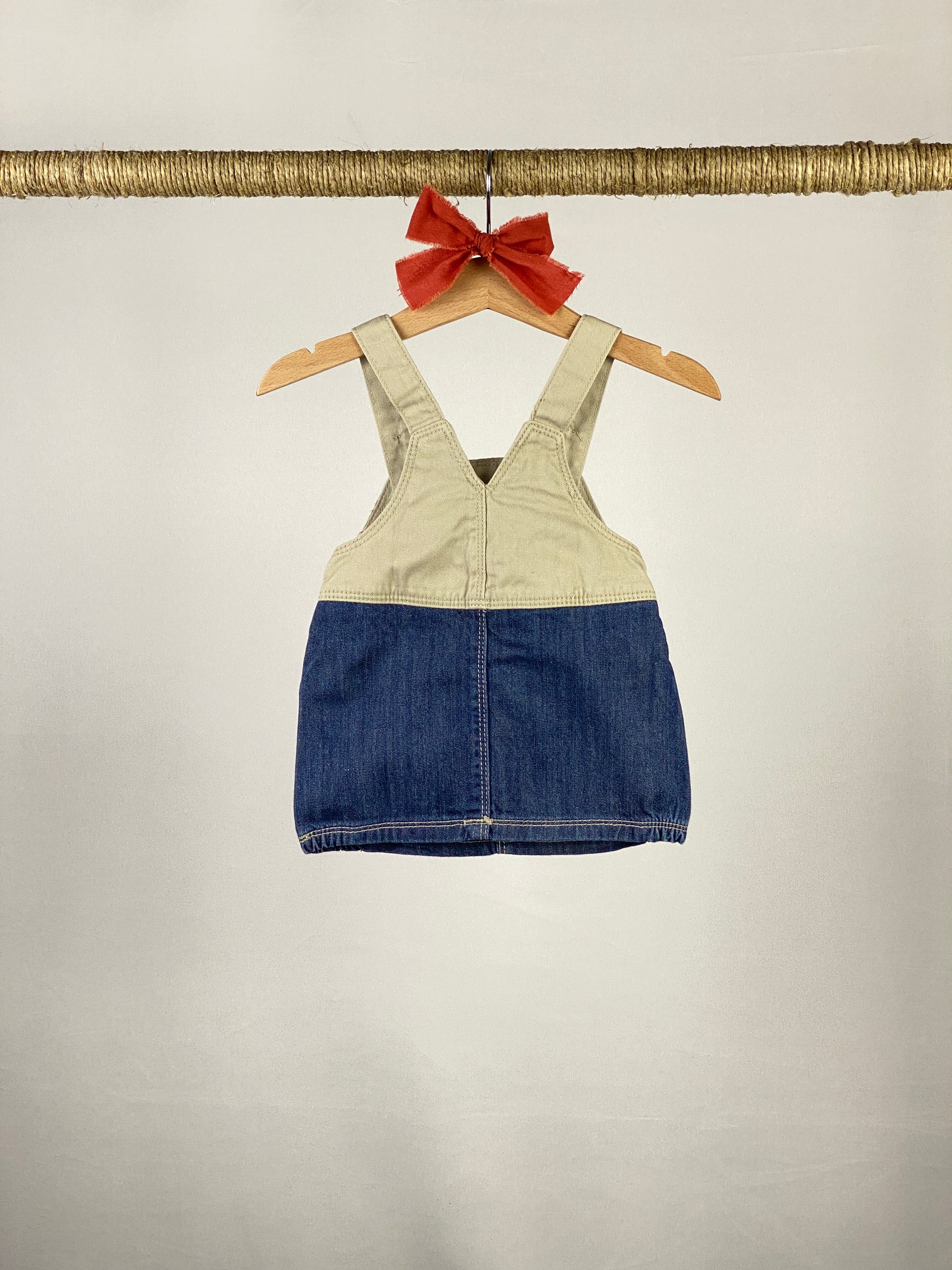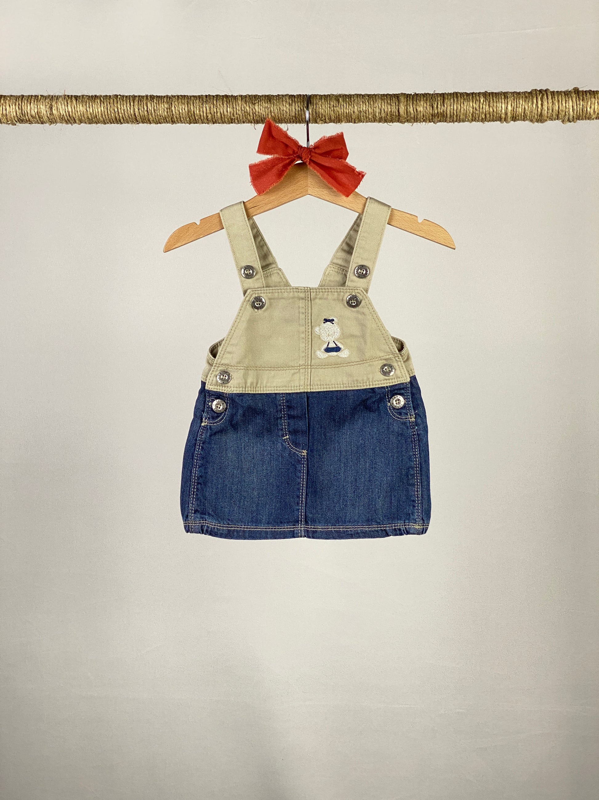 Slopette con gonna in jeans blu e beige con bretelle regolabili con bottoni in metallo, apertura laterale con bottoni in metallo e applicazione orsetto lato cuore